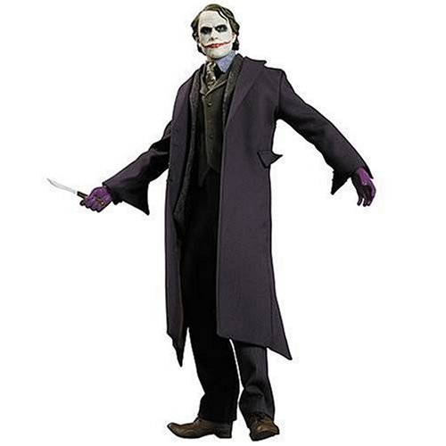 Dark Knight The Joker 1:6 Scale Collector Figure. Christian Bale once again embodies the man behind the mask in "The Dark Knight." The film reunites Bale with director Christopher Nolan and takes Batman across the world in his quest to fight a growing criminal threat.With the help of Lieutenant Jim Gordon (Gary Oldman) and District Attorney Harvey Dent (Aaron Eckhart),Batman has been making headway against local crime...until a rising criminal mastermind known as The Joker (Heath Ledger) unleashes a fresh reign of chaos across Gotham City. To stop this devious new menace - Batman's most personal and vicious enemy yet - he will have to use every high-tech weapon in his arsenal and confront everything he believes.