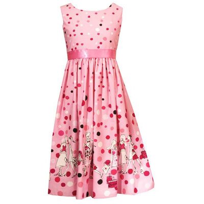 Pretty pink sleeveless dress features a satin ribbon-trimmed waist with bow detail. Tie backs and back zipper closure. Fun 'girls shopping' print! Perfect for any occasion!