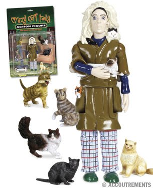 Crazy Cat Lady Action Figure. Every town has a Crazy Cat Lady. The one who lives in a tiny house full of feral felines. This 5-1/4" (13.3 cm) tall, hard vinyl Crazy Cat Lady Action Figure has a wild look in her eye and comes with six cats.